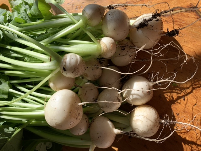 Tokinashi Turnips. Absolutely wonderful. It’s a Japanese variety that you can eat raw, stir fry, roast, or pickle. Pearl white, blemish-free root, and the greens may be even better than the root. If you are like me and are in a warmer climate and struggle to grow winter and early spring vegetables, give these a try. This harvest was actually from about a month ago. These will be the first things sown back in the ground here come October.