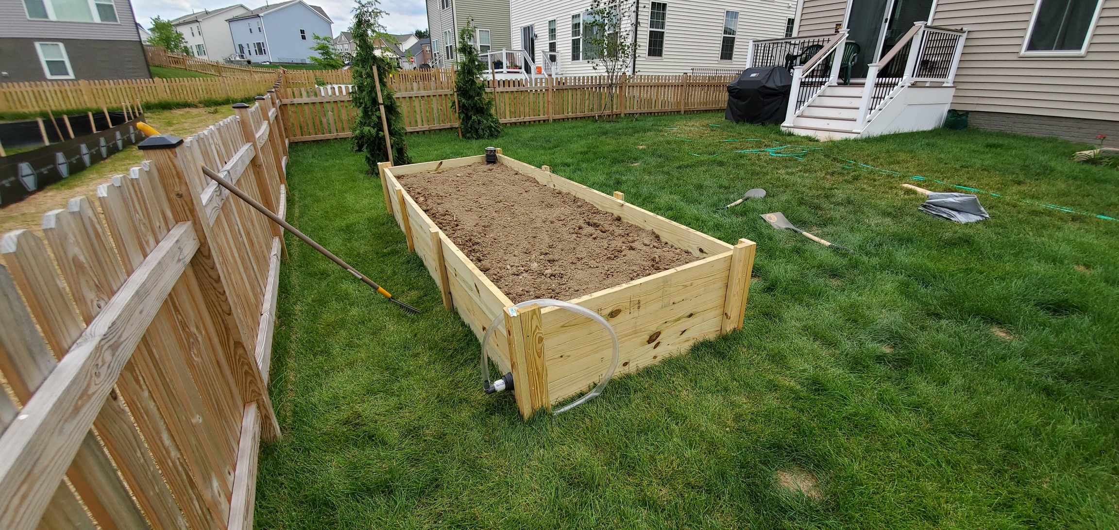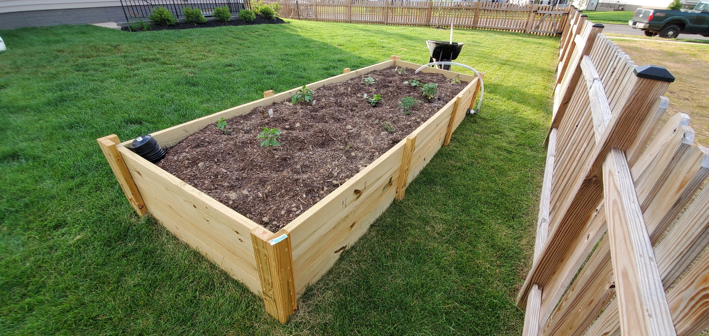 Spent the weekend before last finally building a wicking bed. The photo is of it 90% complete; still had to add another 3/4 yard of garden soil and trim down the overflow tubing. To start, the wife planted peppers, tomatoes, lettuce, and chives. Next project: build screen frames to keep the dog from jumping up and digging/running across it.