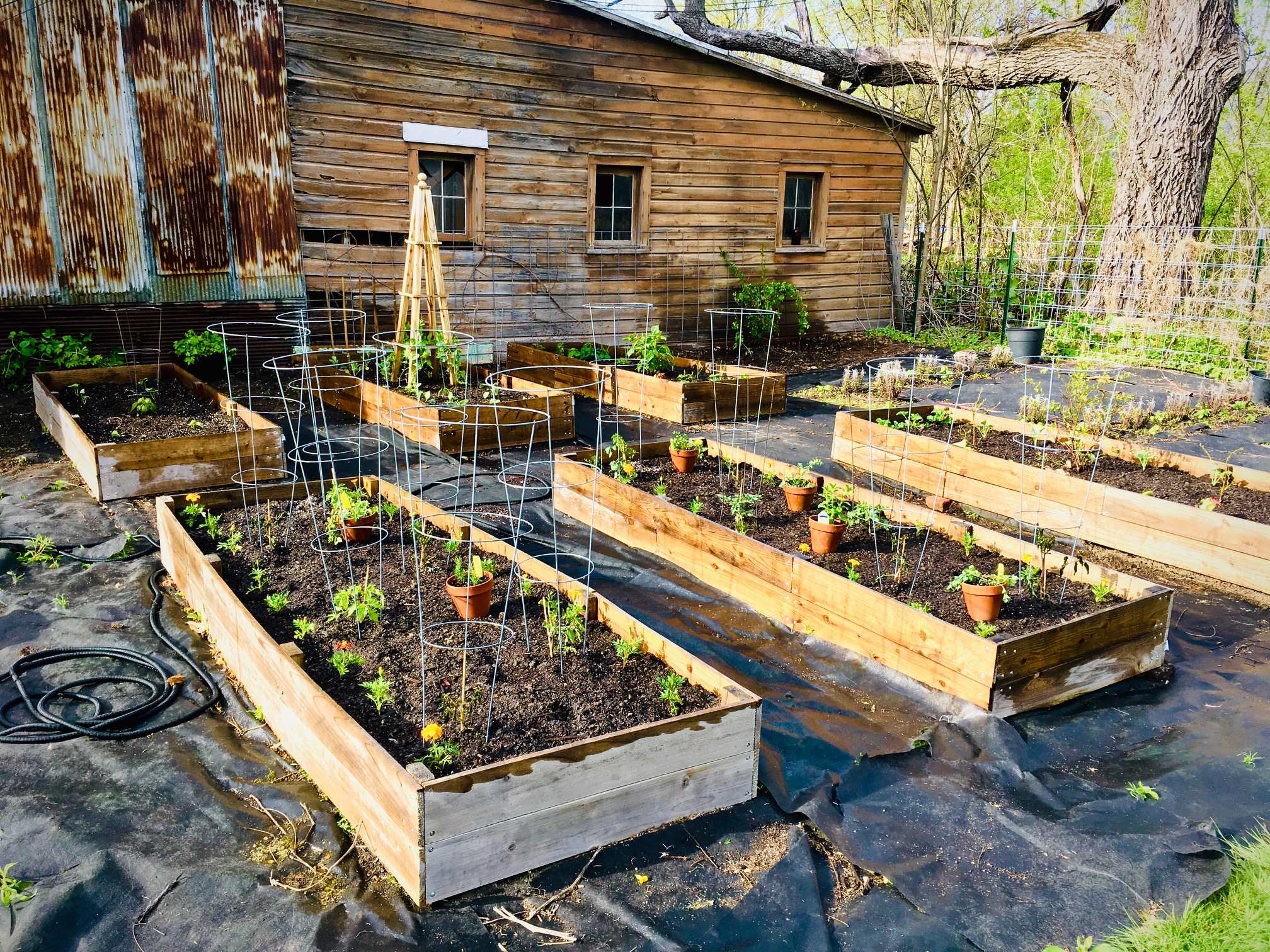 Finally passed all of the snow and frosts and was able to start the garden beds. First two beds on the right are all of the tomatoes. 6 San Marzano plants, and then two golden cherry, two midnight black cherry, and two bushsteak. Last bed on the right is 3 blueberry bushes, lettuce mixture, red leaf and butter, and along the back of the bed is Brussels sprouts, and at the left end are strawberry plants, end of the right not pictured is a clump of nasturtium. First bed on the left is 4 cucumbers on the left, 4 cantaloupes on the right, an amazelbasil plant in the middle. Second bed is 4 zucchini, a snow pea trellis, and 4 eggplants. Last bed is the other berry bed with 2 raspberries and 2 blackberries. It has strawberries at one end and geranium at the other. Also has lettuce and onions. Planted marigolds in the tomato beds and the herbs in the pots will be attached to the barn in the back. Along the barn, there's 3 hop plants and we are putting up some panels for it to grow up. Next to those is a grape vine and then a wild black berry bramble. The empty space behind the beds, in between the two black planters is where the greenhouse goes. We should have that up by next week, maybe the end of this week. The weed cloth is going to be covered with pea gravel and that will be coming on Thursday. The back panel fence I have 8 grapevines which will go in once the guy comes next week and does a final clear out of the wayback yard. The veggie/greenhouse/orchard area is coming together rather nicely. I'll post some photos once everything is complete.
