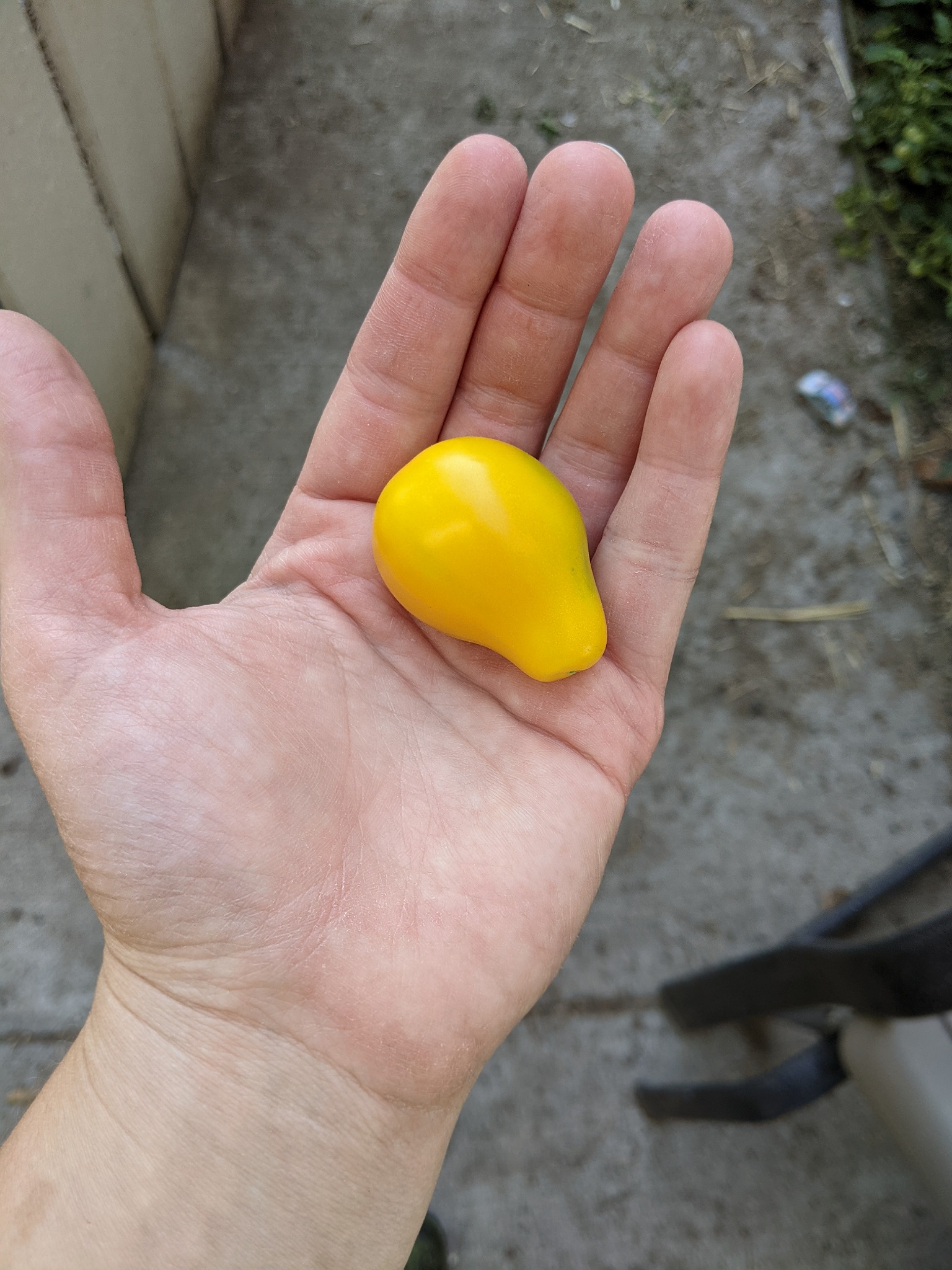 I finally have yellow pear cherries trickling in. The plant is absolutely packed with them. I have hundreds of green ones. Some of them are monsters.