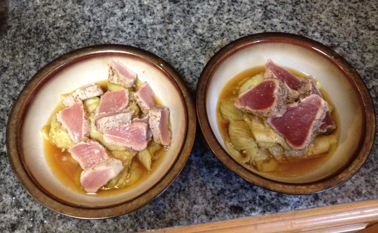 My wife mentioned in her thread that this was her favorite thing I make. It also happens to probably be the easiest. Take a large cucumber and peel it. Slice it as thin as you can (I used a slicer I had on my cheese grater, which made it almost paper-thin) into a large tupperware container. Then, in a large measuring cup, do 3/4 cup of seasoned rice vinegar, 1/4 cup of water, about 5-6 dashes of soy sauce (I like more, so I just do it to taste), about 3-4 cloves minced garlic, about a tablespoon each of sugar, black pepper, and sesame oil (use a little more if you want. I also used a little chili oil and sriracha). Taste and add whatever to get it where you want, pour over the cucumber, cover and put in the fridge for an hour or so. My buddy gave me some fresh blackfin tuna yesterday, too, so I did a light sear and served over the top with a couple drop of sriracha for each slice (after I took the photo).