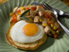 This is a recipe that I've found to work great for the weekend after Thanksgiving when I'm trying to clear room out of my fridge. This is fairly easy as most of the prep work on the food has already been done. Also, this is a great morning cure for a Sunday hangover. Potato Cakes with Fried Eggs and Turkey-Red Pepper Hash Yield: 4 servings Ingredients 1 cup leftover mashed potatoes, at room temperature 1 large egg, plus 4 more for frying 1/4 cup milk 1/3 cup all-purpose flour 1/2 teaspoon finely chopped sage Coarse salt and freshly ground black pepper, to taste 5 teaspoons extra-virgin olive oil 1/2 small onion, chopped 1 clove garlic, finely chopped 1 small red bell pepper, stemmed, seeded, and chopped 8 ounces diced leftover turkey meat, about 2 cups 1/2 cup leftover turkey gravy 1/4 cup leftover cooked corn kernels 1 teaspoon chopped fresh parsley Directions: Preheat the oven to 200degrees F. In a bowl, mix the potatoes, egg, and milk together until combined. Add the flour, season with salt and pepper, and mix until smooth. Heat 2 teaspoons oil on a non-stick griddle over medium heat; pour about 1/3 cup of the batter onto the warm griddle, gently spread it to a circle about 4" wide, and cook, flipping once, until golden brown, 3-4 minutes per side. Transfer to the oven to keep warm. Repeat with remaining batter. Heat 1 tablespoon of oil in a small skillet over medium low heat. Add the onion and garlic and cook until softened, about 5 minutes. Add the red pepper and cook until softened, about 4 minutes more. Add the turkey, gravy, and corn and cook, stirring, until turkey is heated through. Season hash with salt and pepper, stir in the parsley, and keep warm over low heat. Heat the remaining teaspoon of oil on the griddle over medium-high heat. Crack the eggs onto the griddle and cook until desired doneness. To serve, put a warm potato cake on each of 4 plates; top the cakes with a fried egg and divide the hash evenly among them.