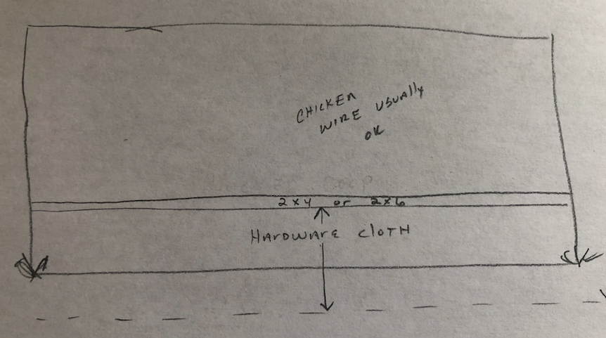The one thing I tell every single person just starting with poultry is this: Build your pen like Fort Knox. Plain old chicken wire is great for some uses, but anywhere a predator can dig underneath your building and get in you will want to secure it with hardware cloth. Any building or enclosed flight pen I dig down around 4" at least and bury part of the hardware cloth. From there up, it depends on what I'm building. If it's a coop, I focus on the hardware cloth being more in the ground and then let the wall of the structure secure them from there. I have one pen which is part enclosed, part open wall. There, I have the hardware cloth still in the ground, but then up about 2' to a cross beam, a 2x4 is fine. From there up it's chicken wire. Kinda like this: Not only is nothing going to dig its way in, but nothing like a raccoon is going to reach in and grab young birds. Sometimes people think it's overkill and a few months later I'll see them post online how something got in and killed all their birds. I had to learn the hard way too, and lost some nice birds to mink or coons.