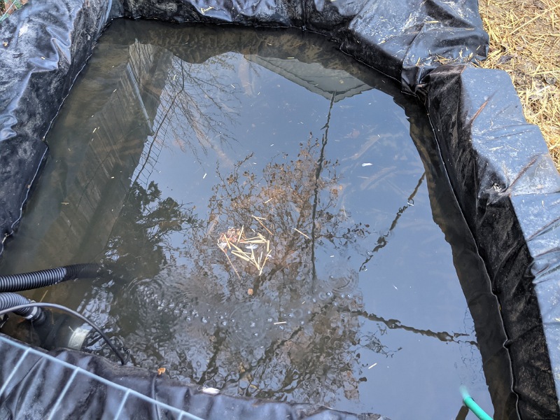 I filled the pond with water yesterday. This is it today. I did a basic setup of the new pond pump and filter and am interested to see how long it takes to clarify. It takes approximately 3mo for the bio filters to colonize and fully filter.