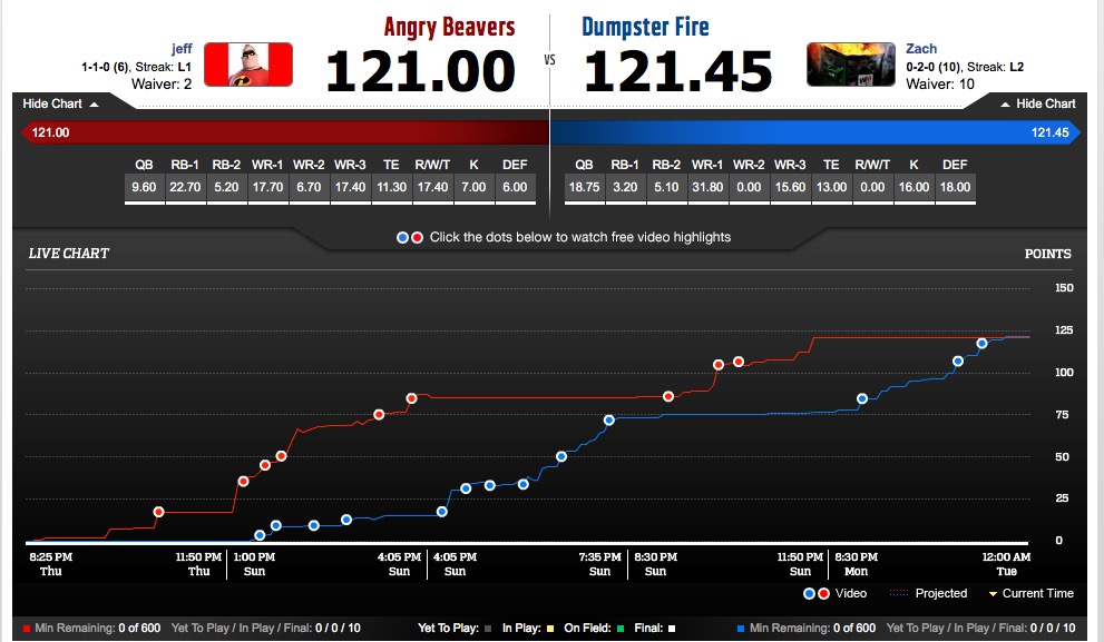 Do you want him to die in a dumpster fire? And wait until tomorrow to curse the gods, there is still time for minor point corrections. Also, finally got my first win of the year taking out the top spot and last year's champion. Feels good to get a W but I'm already looking to Week 4. Already have waiver wire requests in for some guys to stream for next week. Need to get through my Patriots Bye week before settling in for the long haul. James Jones, even though everyone wanted to give me shit for it, did me pretty good this week with 25 points. Let's keep this going.