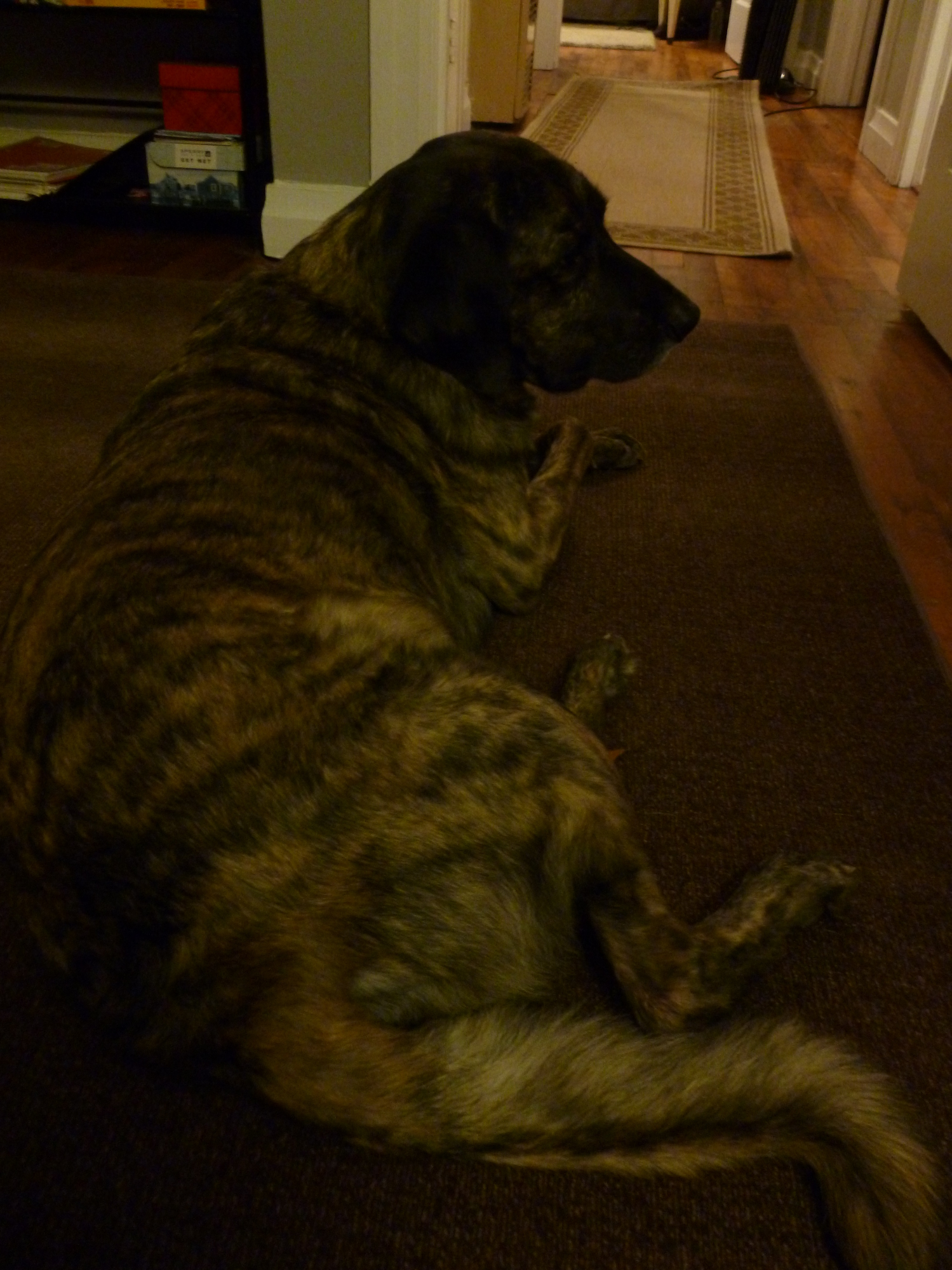 We are on day 4 of this. She has a helluva lot of trouble standing up, laying down, and squatting. Once the stiffness is out she is getting a bit more movement, to the point where she will try to start to run and jump as she is using the bathroom. Anyway, here's a picture of her as I was trying to cajole her to go outside, but she wasn't really having it. Thanks in advance for any input on all this.