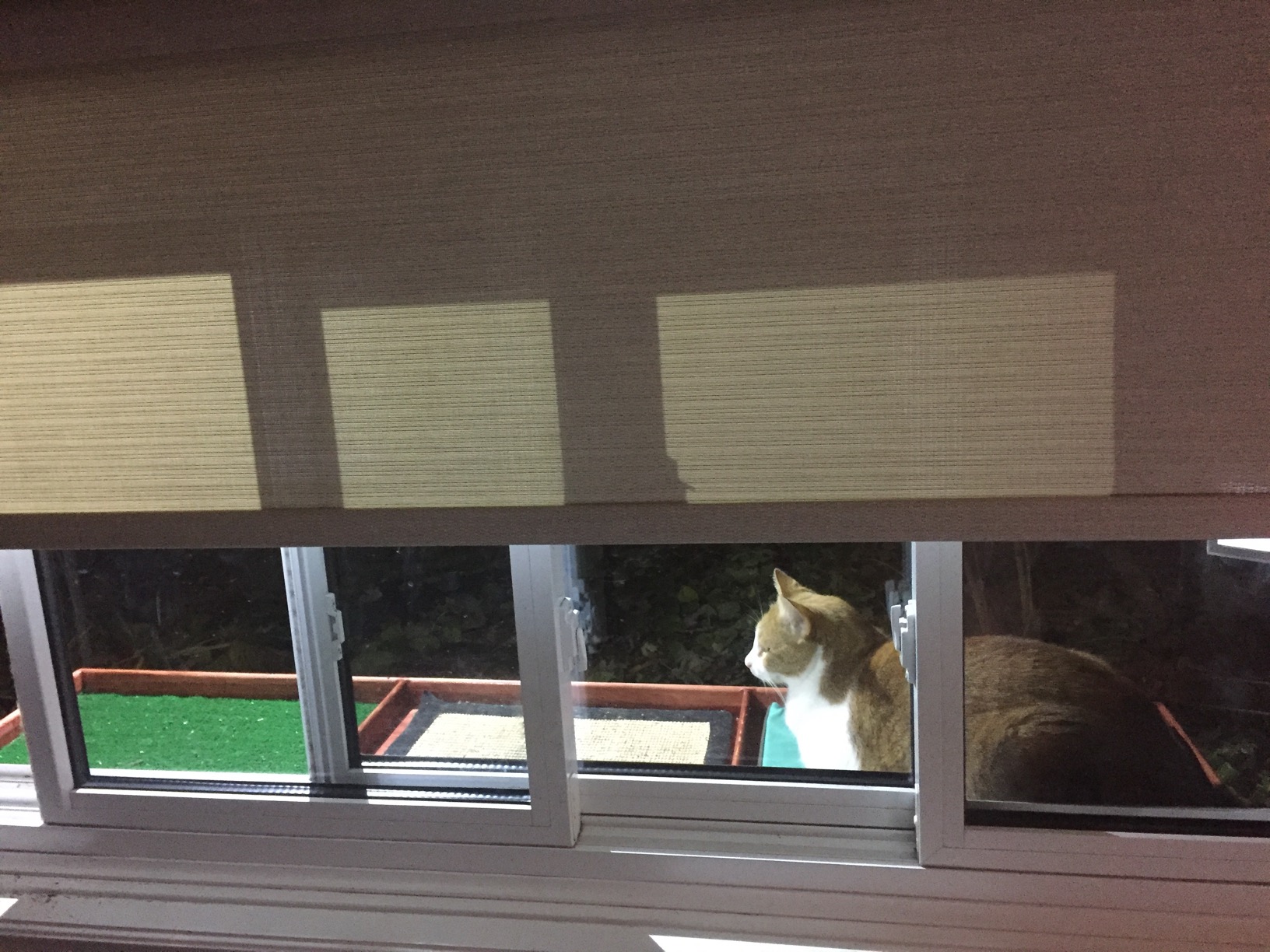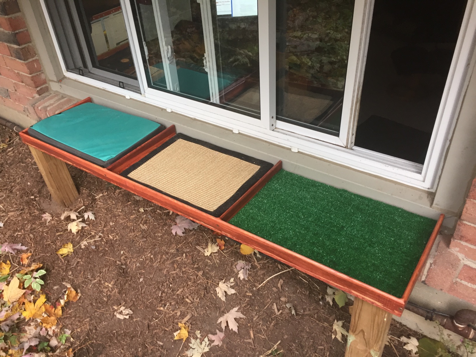 Made a fancy 3-part cat viewing platform. 1 section is astroturf (to help keep the mud on the outside as they come in/out), the middle one is a scratch pad, and the end one is an insulated cushion.