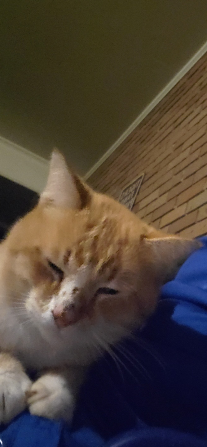 This guy has been hanging around all this time, but often leaving for a few days at a time. So we decided we needed to take him to the vet to get him checked for a chip and any shots he may need. He also has a badly swollen paw pad. The vet drew blood to test for Feline Leukemia and FIV. Negative on the Leukemia, Positive for FIV (and an ear infection)... fuck fuck fuck. I knew all this time there was something a little off with him. He's somewhat active, still has energy to jump up to a table where we set him up with a box with blankets to sleep in. But he mainly just wants to be inside and sleep on the couch next to me. With my wife's asthma, him sleeping in the house is not an option. We do let him in for hours at a time and he normally just sleeps until he wakes up, wants to eat or go out to do his business and then immediately wants to come back in. Our options were to to euthanize (no, nope, never), send him to an FIV no kill shelter 4 hours away (looked at it online and it's already got @ 70 other cats there) or to try to keep him inside. He already had an accident and made a huge stinky mess in our bedroom so we weren't even entertaining the thought. So now we've gotten a litter box and moved his bed into our storage room which is climate controlled. He's going to have to sleep there during the nights and I guess he will be an inside cat except for bedtime. My wife is the one who wants to do that even though her asthma has been pretty bad since he's come into our life. But she's just as dedicated to giving him a good life as I am.