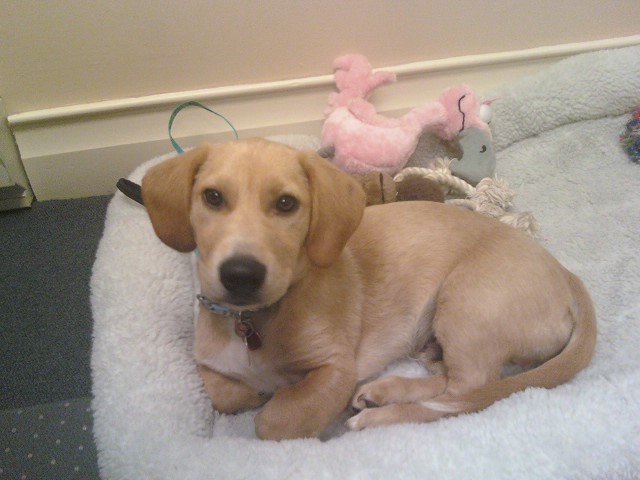 My boss's weird little dachsund/lab mix puppy hanging out in my office for a little while. He's gotten bigger since I lasted posted a picture of him.
