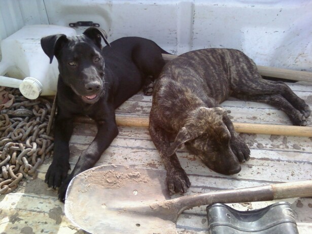 Here are my two pitbulls, Dixie (brindeled) and Dozer (black) after they have tripled in size since the last picture posted on here.