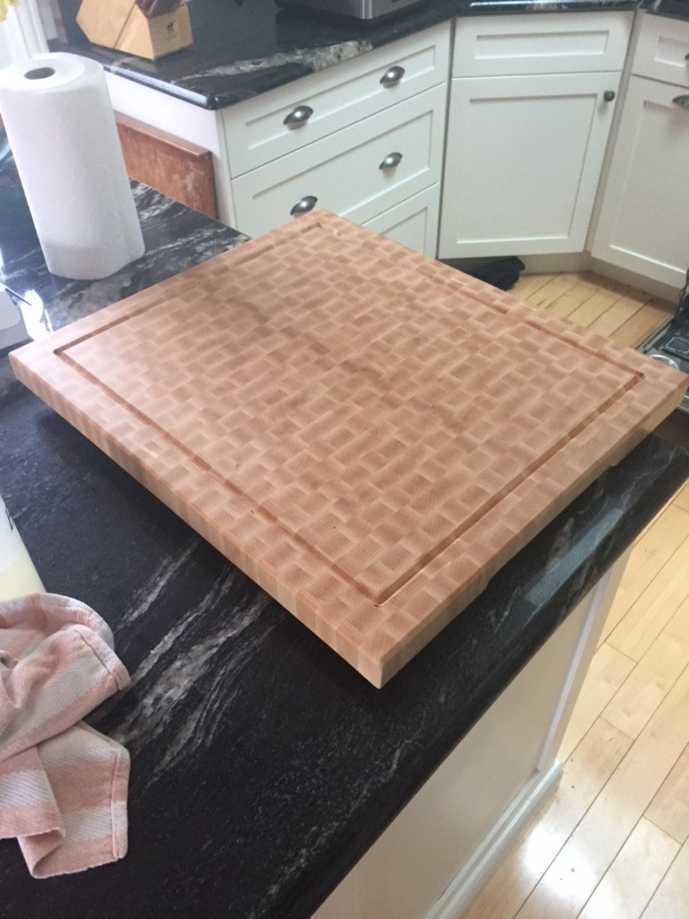 Had a few pieces of hard maple laying around so made myself a new end-grain butcher block style cutting board: It's pretty heavy, and has lots of surface area... with handy meat juice catching grooves. Right now it's just soaking up oil like crazy.