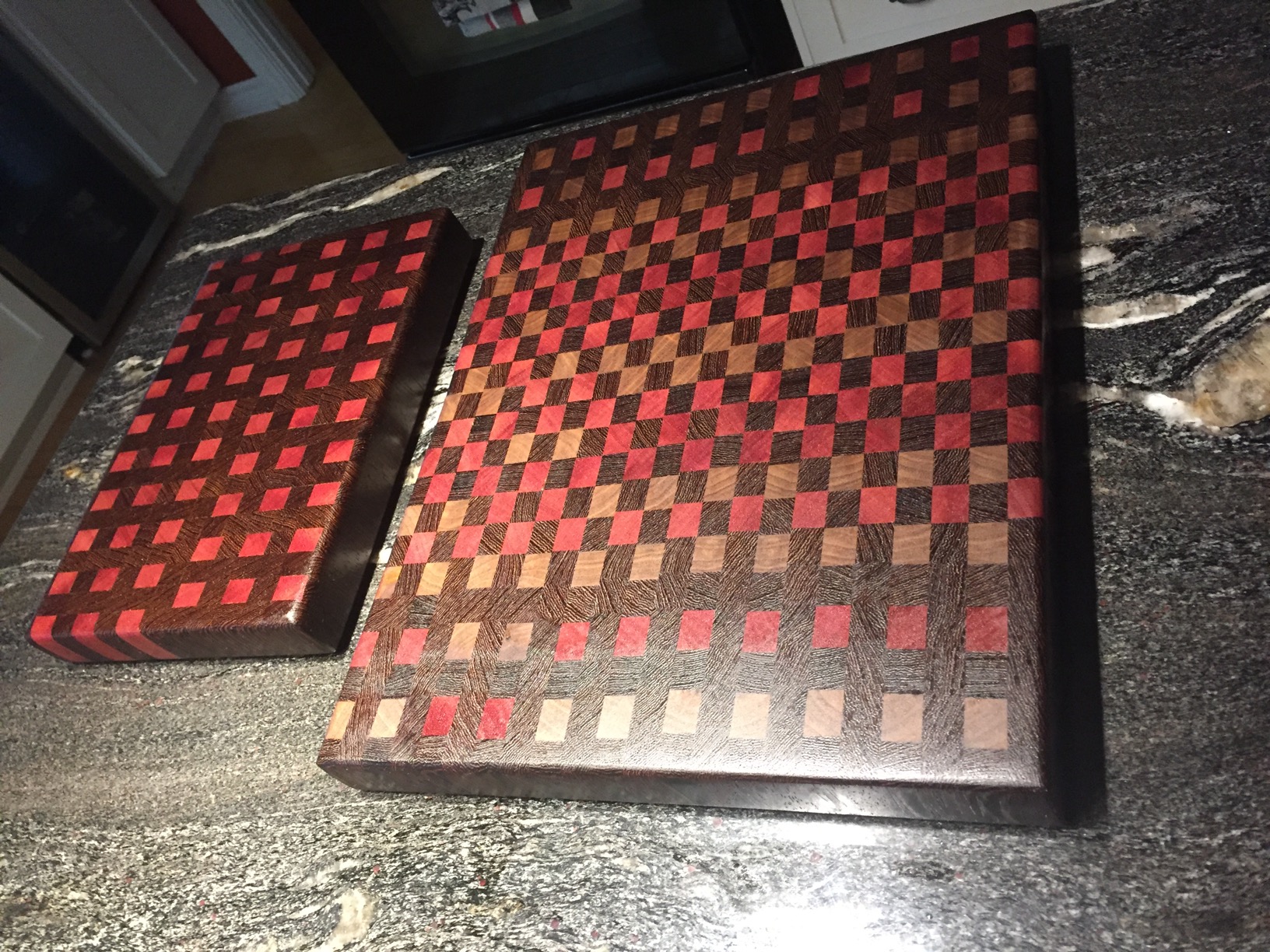 Finished off my Mother's Day Gift for next weekend. Combination of zebra, purple heart, and walnut. Pretty happy with how they turned out... very simple, not at all perfectly aligned or with a symmetrical pattern, but I like it that way. These were, for the most part, scraps from the Christmas presents I made my sister and her friend. The zebra and purple heart were really hard to work with, as they seemed to be forced dried too quickly, which results in the wood binding up. That meant that every time I cut a strip the strip just warped all to fuck right away. Needless to say it was hard to be anything near precise with cuts. Most of these boards were the result of tons of glue, brute force, and lots of strong clamps.