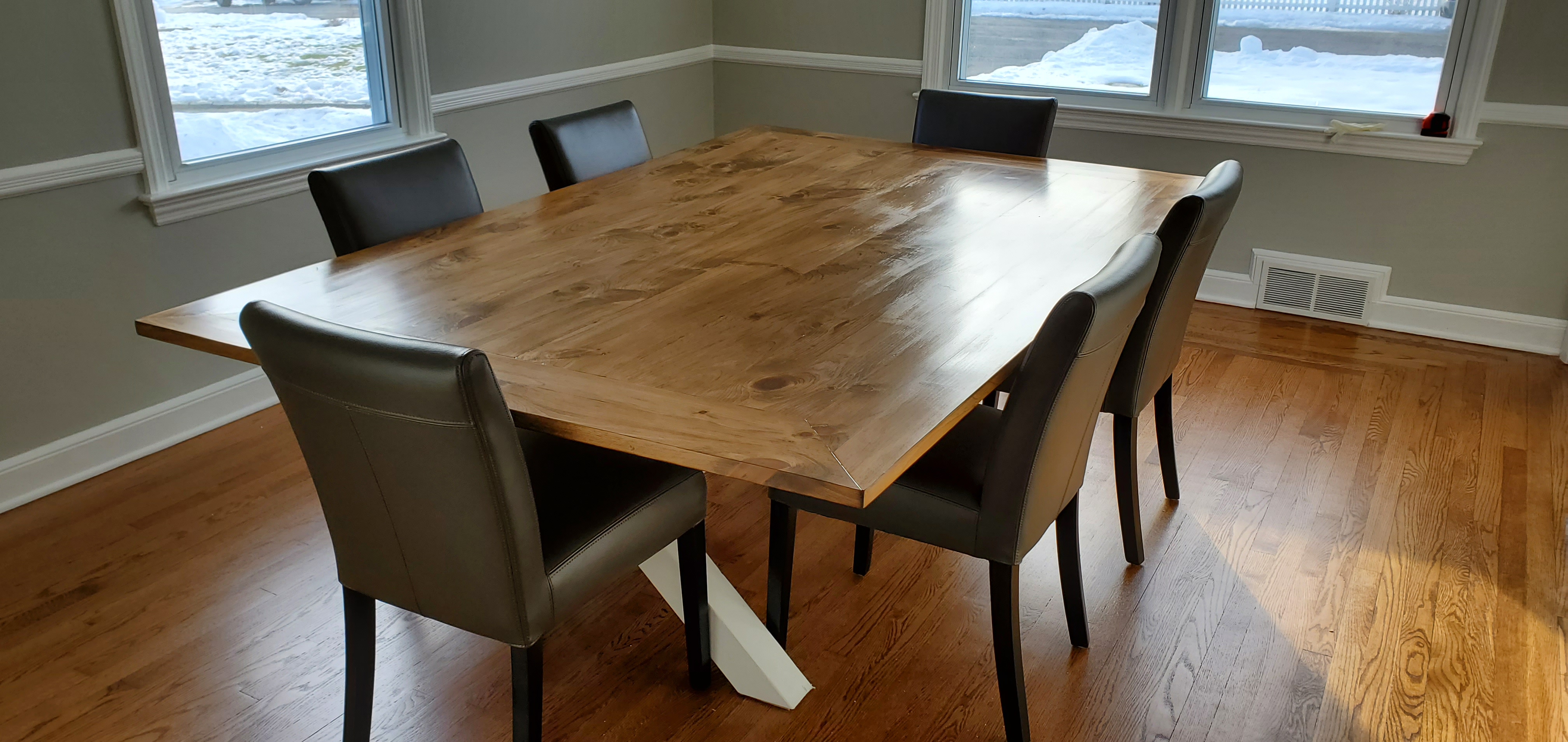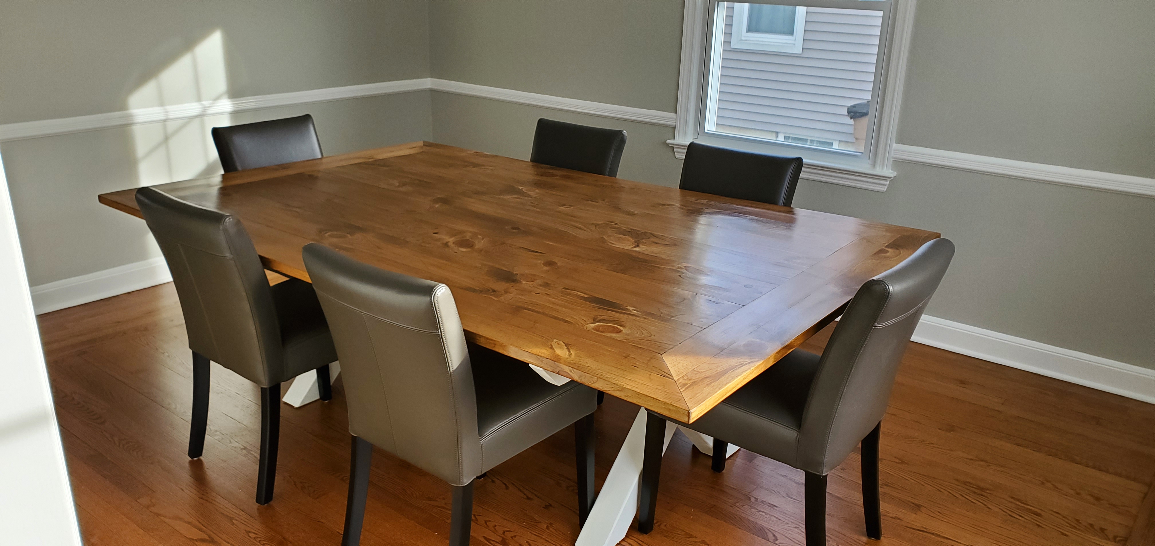 Finished the tabletop for my sister's dining room table today. Pipe clamps were a freaking dream. Thanks for the idea @Nettdata Tabletop is 90" x 57". Plenty of room to fit 3 on a side and 2 on each end comfortably. Can easily make it 4 and 3, respectively, without folks eating with t-rex arms. Their hardwood floors have a framed pattern to them, so I wanted the table to tie into that and framed the outer edges with 45 cuts at the corners. Really happy with how it came out. My best work yet, I think. This was a completely bespoke job. I picked out each board with them so they could see the knots and grain. When it came time to build, they chose how each board was oriented, which side would be the top, etc. I way overbuilt the top, so I hope this is something that they can give to their kids someday. The frame is a X style on the ends. I notched 4x4's to build it and filled every seam and crack with wood filler, sanded, and filled again. I have a Wagner sprayer that I'll use to paint it white, so the whole thing will look like a single piece when it's done.