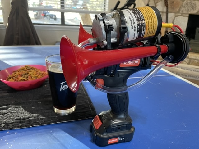 The better question is, why is there a random ping pong table in the middle of a living room with cat food on top, a beer and a redneck air horn?