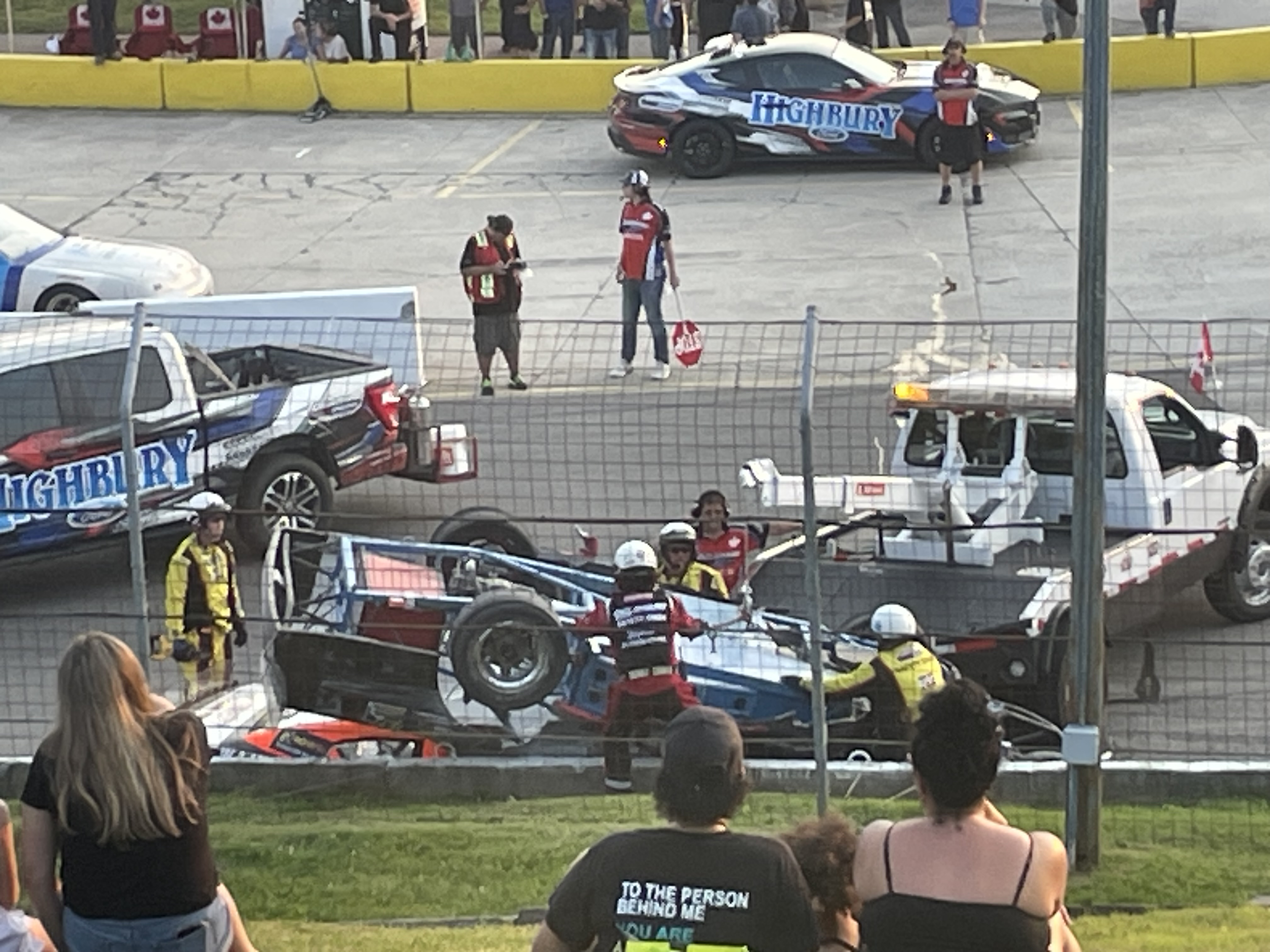 Half hour bc at least. The drive in the flipped car on top was stuck in it so the tow truck driver just yanked him off as I safely as possible. His girl was SCREAMING from the pit while his crew chief smashed his headset. Thos was also the first time my daughter and I EVER watched a race there. Now she wants more. I told her “Our trailer is like, five minutes from the Grand Bend Motorplex. If you want loud, I’ll show you LOUD.”