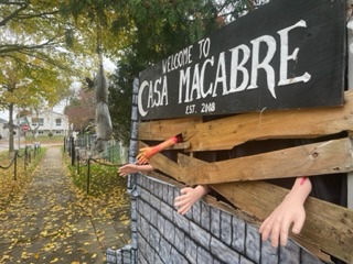 There’s a warning sign at the start. I don’t put that part up all month, just the weekend before Halloween and up until. Fishing line is the secret to everything. It’s strong, super-cheap and at night things look like they’re floating because you can barely see it.