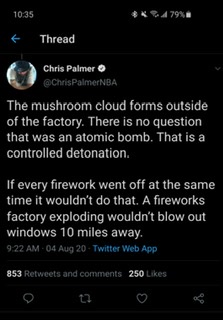 In a way, fireworks are almost more dangerous than munitions, as usually they involve many exotic chemicals to get various lighting effects, and it's mostly somewhat loose powder. That was terrifying... and I was also amazed at how little it took for the camera operators of all the footage I've seen so far to recognize the explosion and then bust ass for nearest cover. In a way, it's kind of sad that they've seen it enough, albeit in a smaller scale (this is listed as the largest explosion Beirut has experienced), that they reacted instinctively. But holy fuck was that intense. AND WHY THE FUCK ARE PEOPLE PUTTING EXPLOSIVE WAREHOUSES SO CLOSE TO PEOPLE? It seems to happen every now and then... there was that fertilizer plant in Texas or something that blew the fuck up and it turned out it was illegally placed... the Chinese port explosion that took out city blocks... and now this. On the plus side... first guaranteed COVID-Free zone?