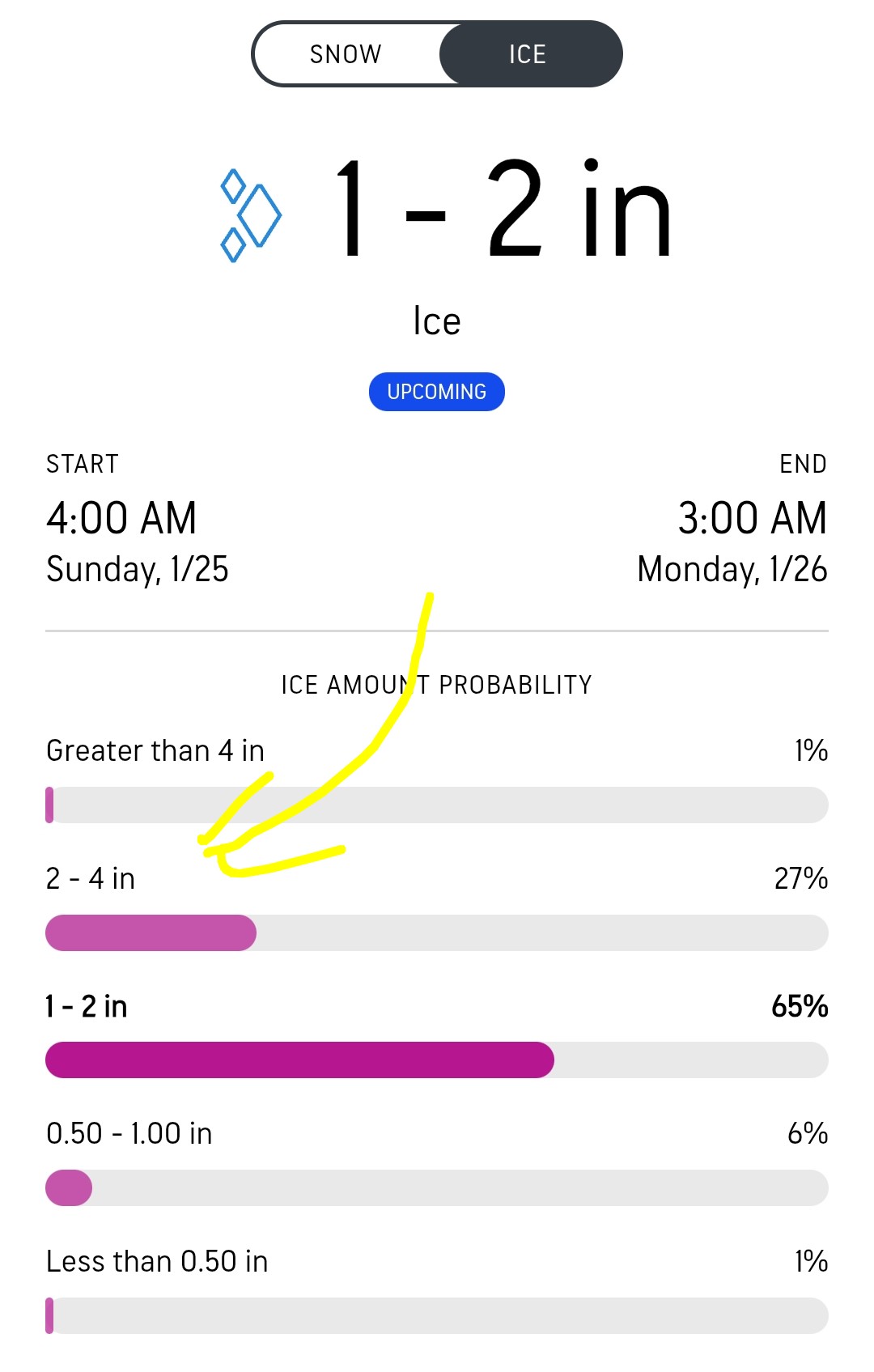 This number below is crazy for this area. 27% chance of 2-4 inches of ice. The 1-2 inches would be bad enough. That's after, and in addition to, the 1-3 inches of snow falling the first 12 hours of the storm.
