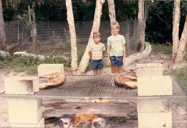 Redneck roots run deep in me. Here is a backyard grill set up complete with construction lumber for fuel, random wire grate to cook on and the hog that my dad shot in the backyard that morning. The other pic is the hunting buggy that he and his friends built.