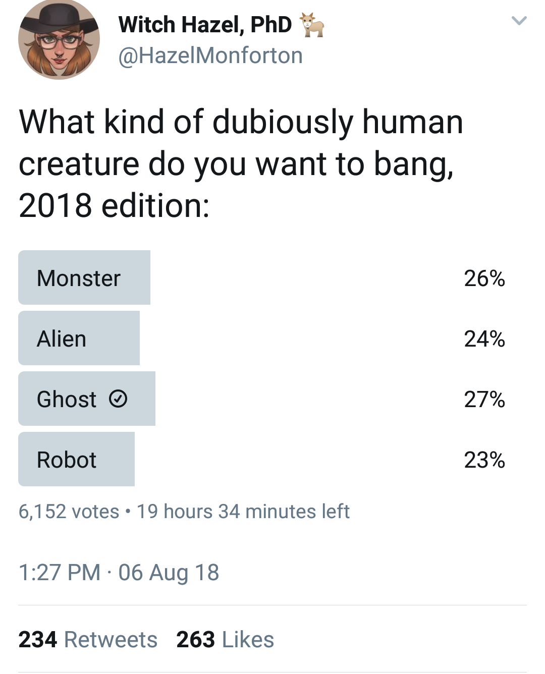 In light of this breathtakingly close race, which would you choose? As you can see, I chose ghost and it was because ghosts are my favorite in general, but after having some time to think I realized ghosts are the safe bet. There are too many wildcards with the others. Like, my friend chose monsters but he was thinking about it in terms of Frankenstein's monster, who obviously is going to be packing heat, but then also probably wouldn't know what to do with it. But any other monster would probably be too scary, and I think there's too big of a chance aliens would be gross. Robots basically already exist for sex so why would you choose that when you could try a ghost? Just some stuff to ponder on the Lord's day.