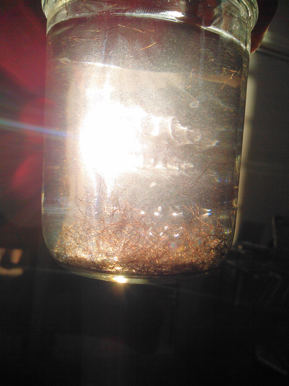 Not as much as you'd think; here's a cup of her pubes after shaping her bush one day. We liked the way that they caught the sunlight, so we took a picture.