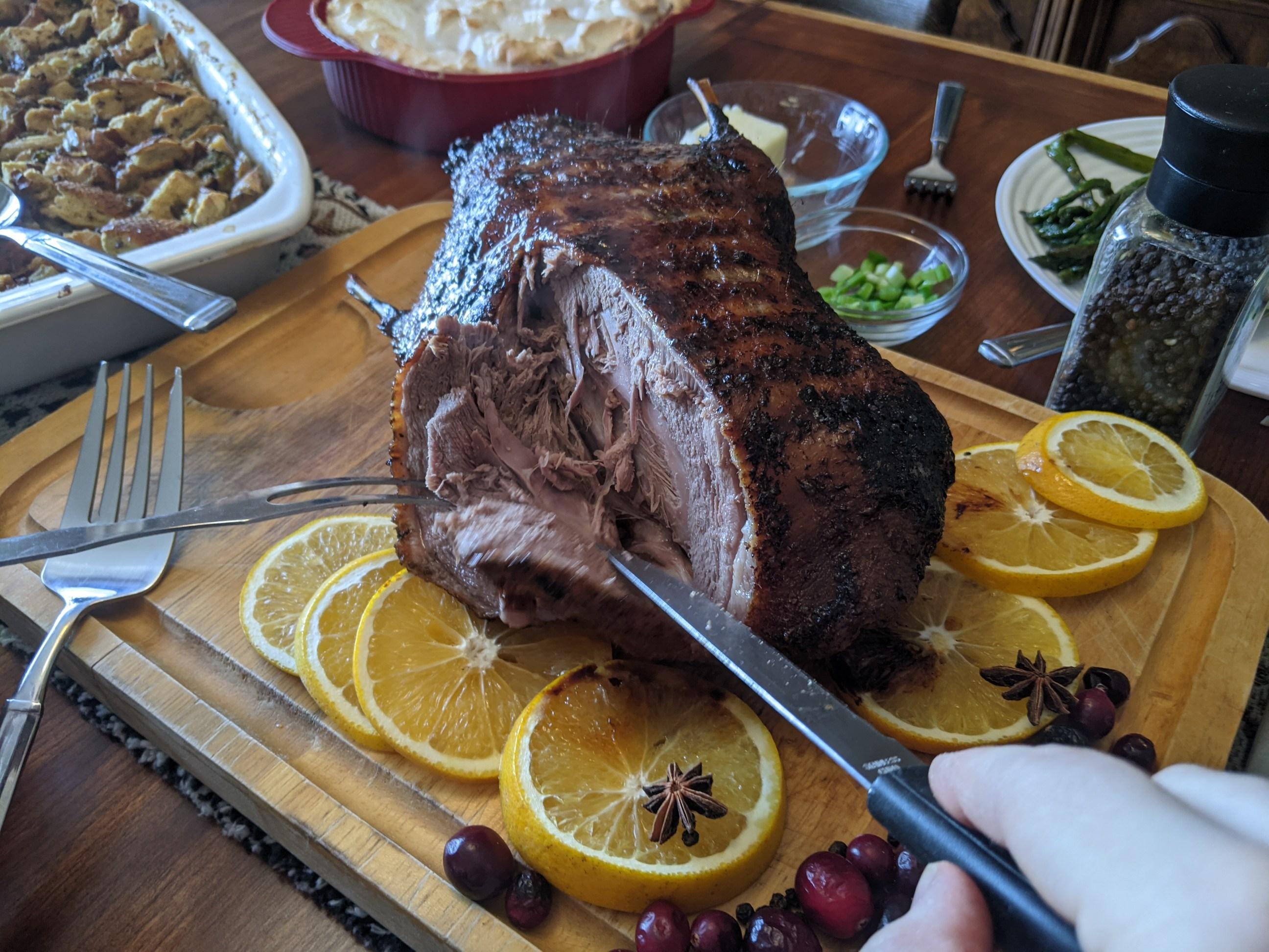 So.. today I learned that I can't carve a bird worth spit. Duck is pretty dark in appearance but if you closed your eyes you'd have a hard time telling it apart from smoked chicken. Maybe like chicken with a touch of turkeyness. The brine was perfect and it would have sucked without it.