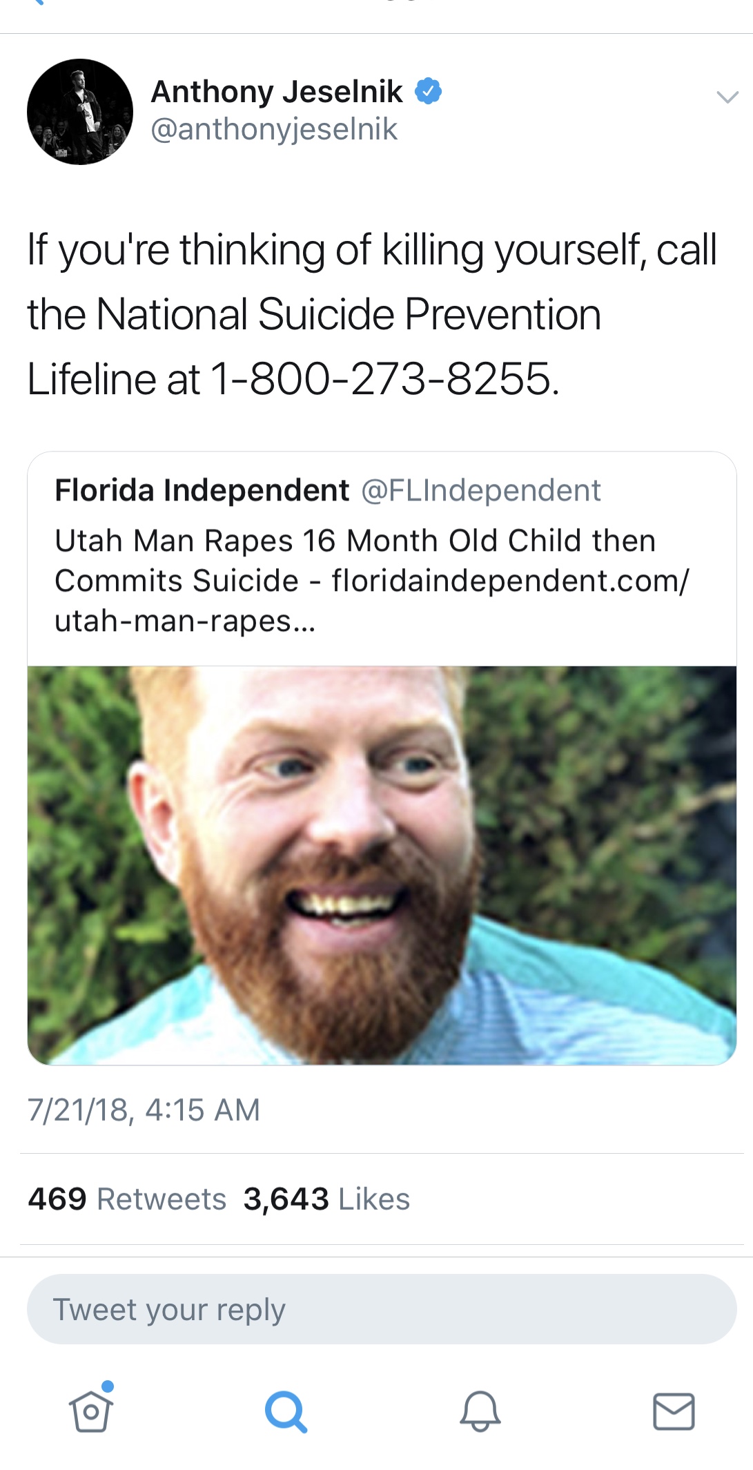 That’s just from yesterday. Whenever something truly terrible or tragic happens, he tries to be the first one in with an obvious ‘too soon’ type thing. He even says so himself. He seems to be respected in his community too, so I don’t see a character attack on him gaining much traction.