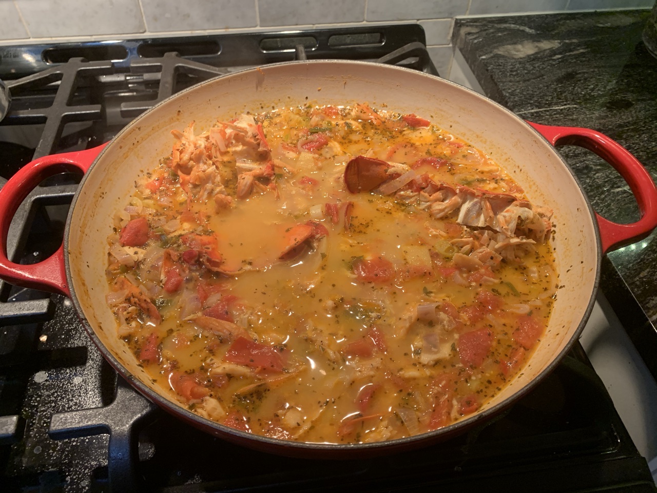 A baguette was had. Recipe is as follows: get shitty white fish out of freezer and thaw find other good fish and thaw find shells from seafood (in this case lobster, shrimp, prawn) sauté garlic and shallots in pan until aromatic. include celery but I had none. Once nicely sweated and at the brink of browning, add shitty white fish that you normally would not eat. add basil, parsley, cayenne and red peoper add seafood shells add a few tomatoes diced up add sliced uo lemon Fill pan/pot with 3/4 water, 1/4 white wine bring to a boil then reduce heat let it gently reduce for 1-2 hours prep “good” fish into chunks once broth tastes yummy, strain into a new pan to remove all solids i added fresh basil, but would normally use saffron and fennel, but had none, so improvised cut good fish into chunks and add to broth I also added some fresh sliced cherry tomatoes at this point add a big chunk of butter and salt to taster bring to a boil and cook fish for 5-10 mins and serve. l