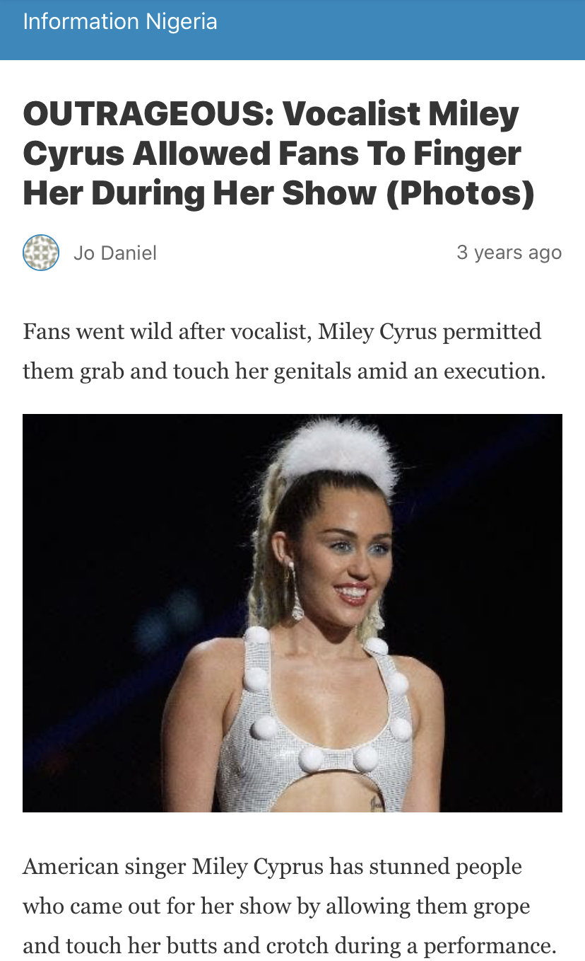 I could give two shits about Miley Cyrus, but really, an article from Nigeria? That’s it? Is there a pop up ad from a Nigerian prince?