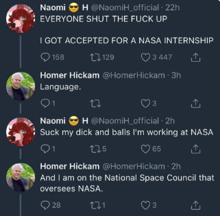Yeah, to be fair, he wasn't the guy who got her fired... someone at NASA saw that interaction and shit-canned her. He wrote a blog post explaining it and has since taken it down. He was more worried about her being detected by NASA. "It occurred to me that this young person might get in trouble if NASA saw it, so I tweeted to her one word: 'Language' and intended to leave it at that," Hickam wrote in the post, which was cited in several news reports. "Soon, her friends took umbrage and said a lot of unkind things, but long after I was gone, as I immediately deleted my comments and blocked all concerned." https://www.space.com/41612-prospective-nasa-intern-loses-position-twitter.html Funnily enough, it looks like all of her friends responding caused it to trend and get on NASA's radar in the first place. Part of me feels bad for her, but part of me also thinks I don't want someone that fucking stupid to be working at NASA.