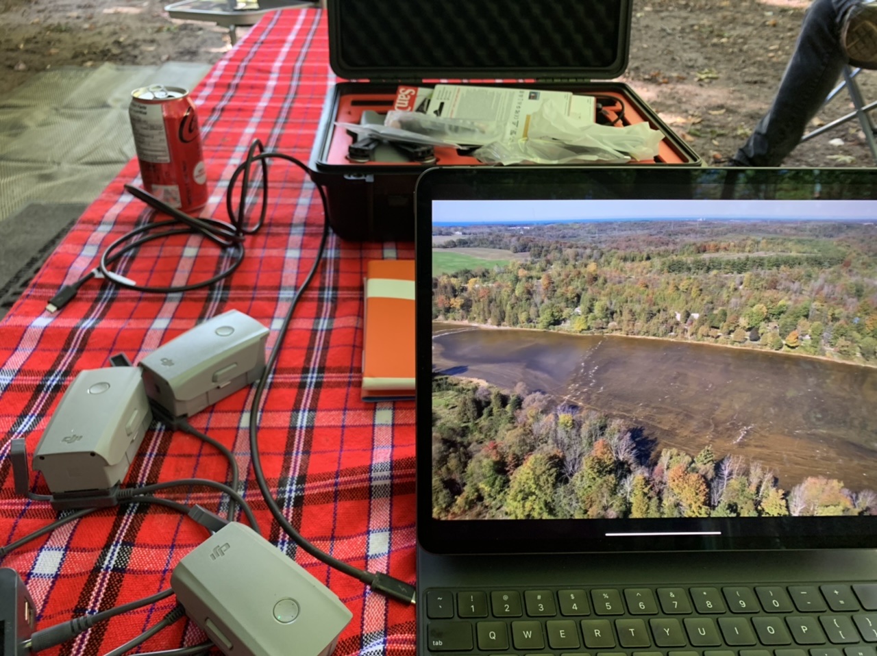 Scouting fishing places on the river with the drone from the campsite. Lots of flood and runoff water due to recent heavy rains.