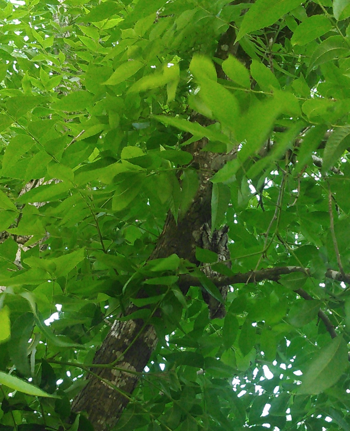 Here's the mother(?) owl on the pecan tree outside the window. Spoiler This type of owl generally stays in the same territory for all of its life, so if these owlets make it, we can look forward to seeing them around for years to come.