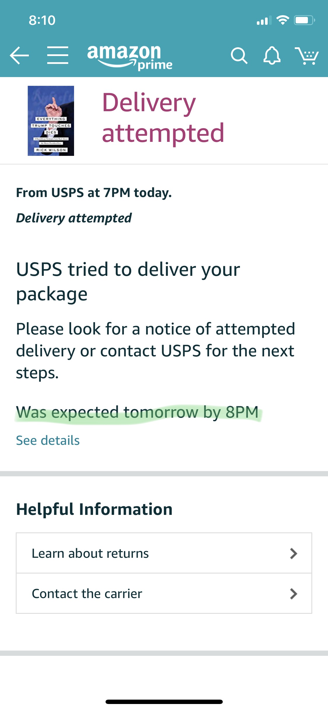 Sometimes I'll get deliveries from them before the date they say. Note that it reads delivery was EXPECTED tomorrow by 8 pm, not that it was guaranteed on that date. Usually anything bought through prime is pretty reliable as far as when it gets delivered, but sometimes if an item is from a 3rd party seller but ships through prime or just your standard delivery, their tracking isn't always completely accurate.