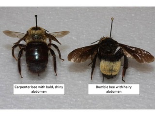 Carpenters and Bumble bees have similar looks. They are both large, but bumblebees are fuzzy and are social who nest together, carpenters are independent like mud dauber wasps.