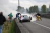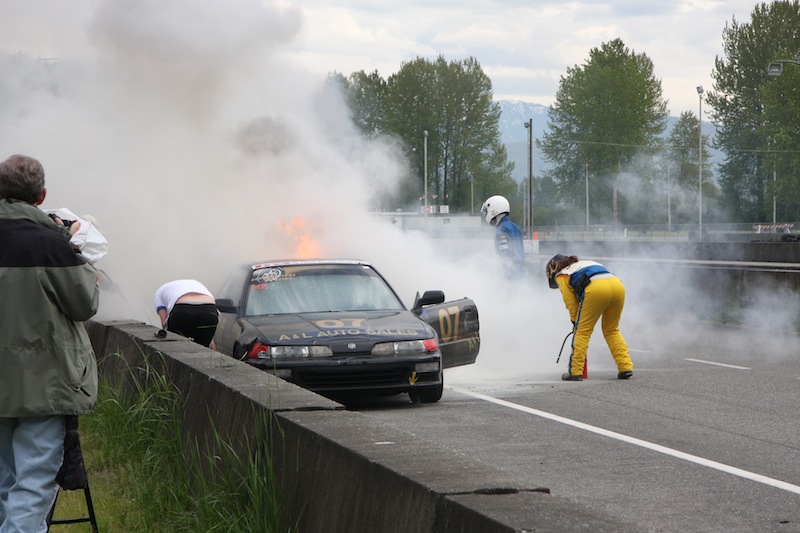 Pics I took of the car fire. Every driver's worst nightmare. The biggest thing you always wonder about racing in your local area is how well the emergency crews will respond. Let me tell you, they did a fucking awesome job. That car came around turn 8, into the pits, and the fire "gator" was already on scene, and the female fire fighter was out and running with a bottle. The guy stopped the car, and she was hitting the driver even before he got out of the car. Hats off to META, and the corner/safety workers. It was a close one today. Oh... and if you're a so-so mechanic, DON'T WORK ON YOUR OWN FUEL CEL AND HAVE IT LEAK GAS ONTO YOUR EXHAUST. Just sayin. "That car don't look right", I said... "FIRE! FIRE!" The firewomen was already hitting it with the bottle. The driver's still in there. Almost out.